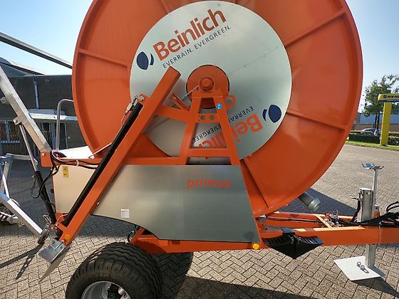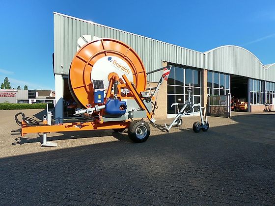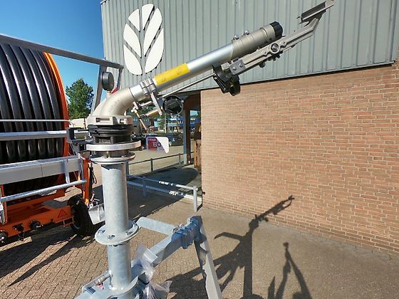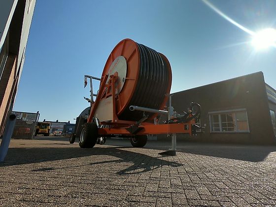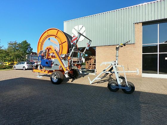 | Nieuwe beregeningshaspel met; – 460 m. PE slang 110 mm constante wandsterkte – hydraulische raaikrans – hydraulische steunpoot – hydraulische stutten achter – beregeningsstatief, 3-wielen – verkeersverlichting – breedtemarkering – enkele as, luchtgeremd – banden 15.0/55 – 17 |