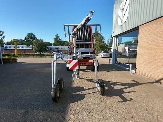 – 460 m. PE slang 110 mm constante wandsterkte – hydraulische raaikrans – hydraulische steunpoot – hydraulische stutten achter – beregeningsstatief, 3-wielen – verkeersverlichting – breedtemarkering – enkele as, luchtgeremd – banden 15.0/55 – 17 |